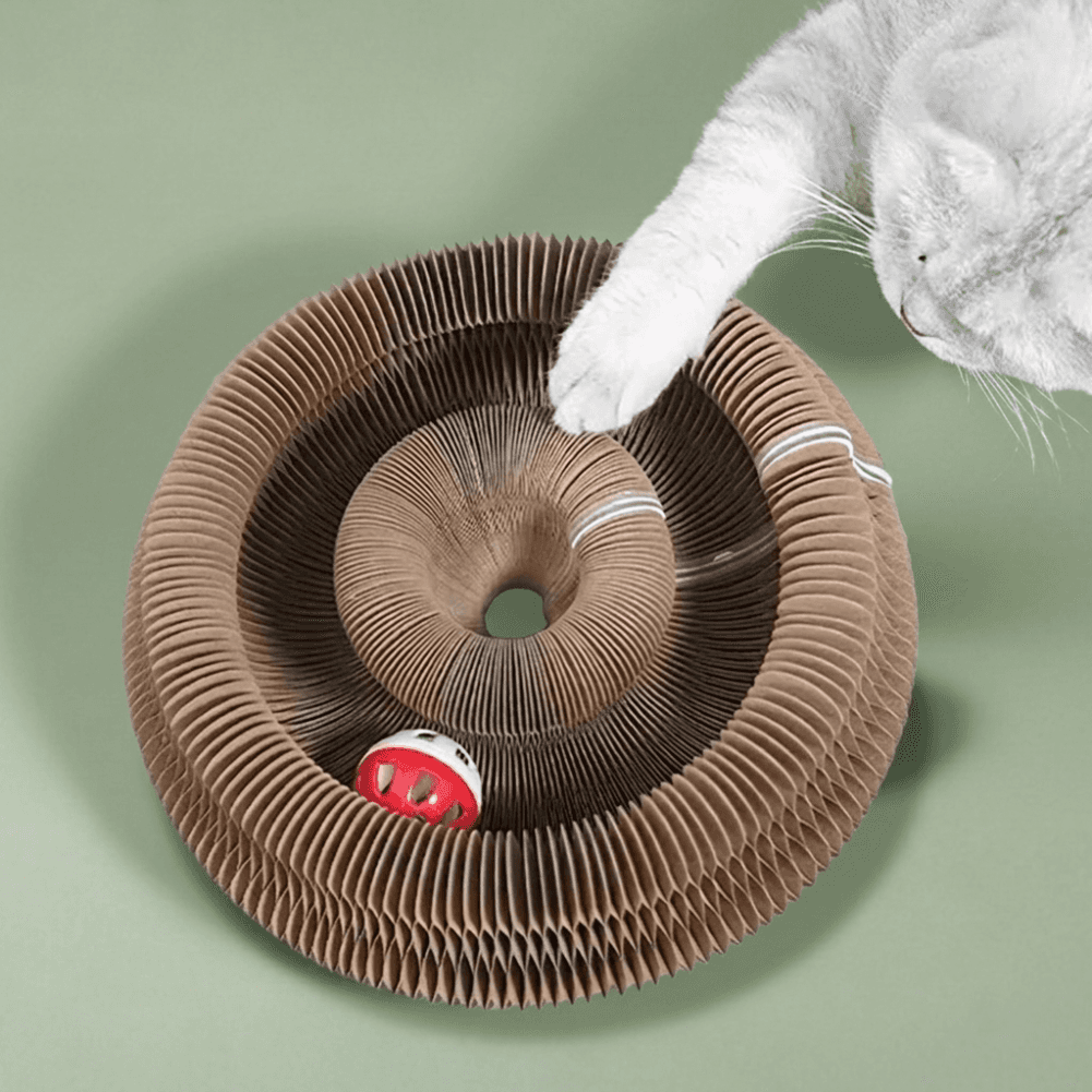 The accordion shape shifts every time she touches it. It compresses, springs back, changes form. From her perspective it never fully reveals itself, which means her brain never gets the signal that the hunt is over. The bell ball inside the track moves unpredictably. She can hear it but she can't see it, which forces the search phase to activate every single session. The corrugated cardboard gives her something to dig into creating tactile resistance that completes the catch.